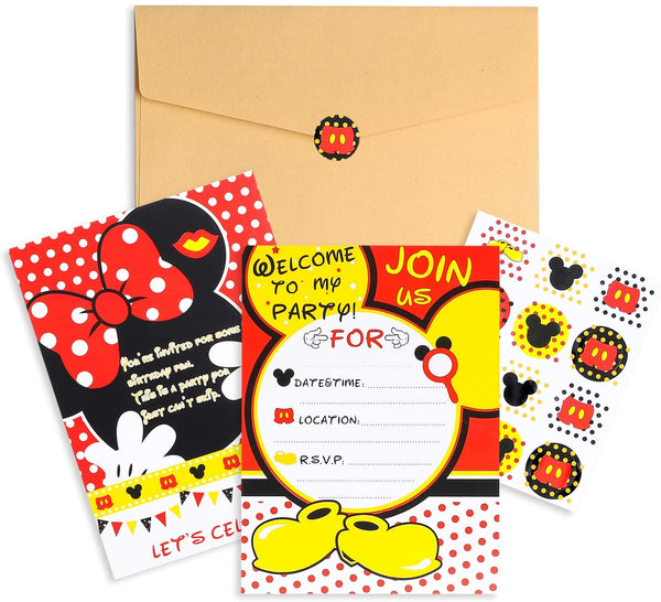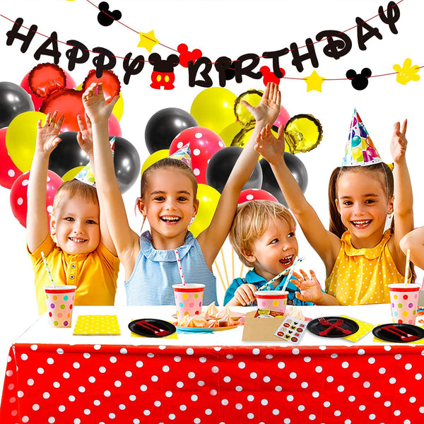 Awesome Party Supplies Set: A unique and dreamy mickey party supplies kit consists of 139pack: 1*Mickey Happy Birthday Banner, 20*Plates, 20*Napkins, 20*Forks, 20*Invitations Cards with Envelopes, 2 Sheets (24pcs) Mickey Stickers, 1*Tablecloth, 3*16inch Aluminum Foil Balloons, 20*Solid Color Balloons, 10*Polka Dot Balloons, 1*Ribbon, 1*Glue Point.