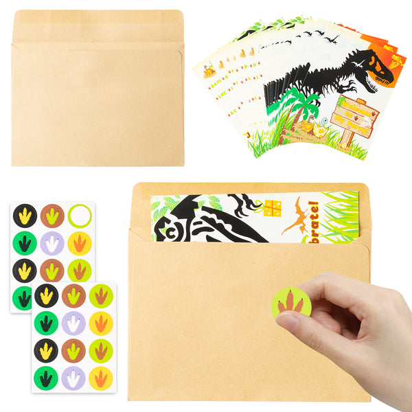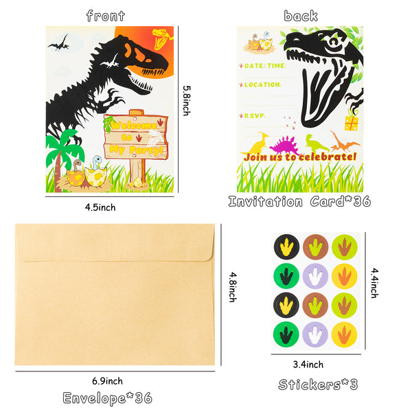 Dinosaur Invitation Card Suit: This invitation card suit is inspired by dinosaurs, with interesting dinosaur patterns printed on the invitation card. It contains a variety of products, including 36 invitation cards, 36 envelopes and 36 small stickers.
