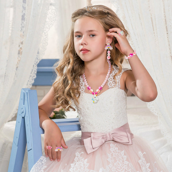 OSNIE 4 Sets of Beaded Jewelry for Girls, Rose Mermaid Unicorn Rainbow Hat Princess Necklace Bracelet Earring Pendant Ring Set Dress up Pretend Play Jewelry Toys Birthday Gifts for Kids Girls (20PCS)