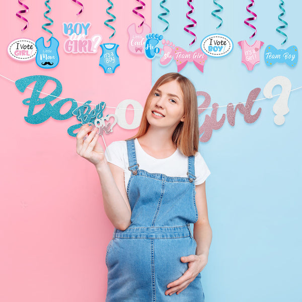 WHAT WILL YOU GET –This package includes 30pcs gender reveal theme cutouts, 10pcs ceiling hanging swirls, 1pc boy or girl glitter banner, 1pc boy or girl glitter cake topper, there also provide with wooden sticks, iron wire, clear plastic hooks and glue stickers. Size details as shown as picture.