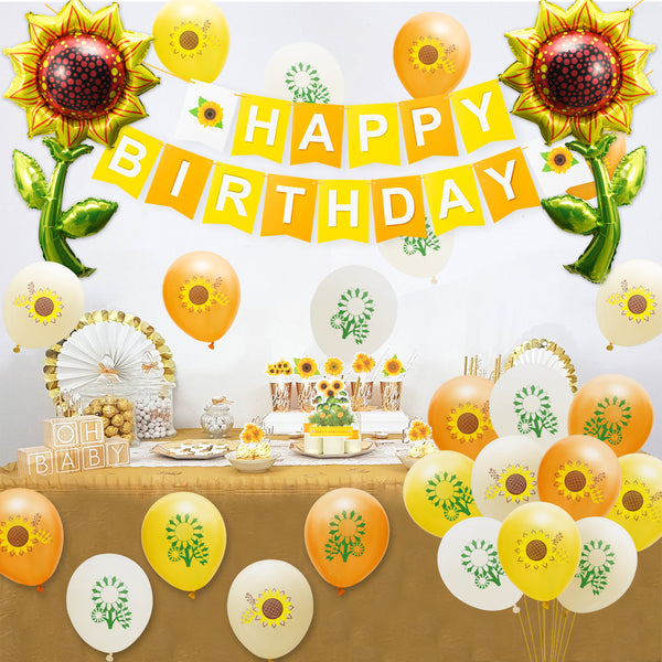 PACKAGE INCLUDED: 20 x sunflower latex balloons, 1 x sunflower happy birthday banner, 1 x sunflower cake topper, 24 x sunflower cupcake topper, 2 x giant sunflower foil balloons and 1 x yellow ribbon.