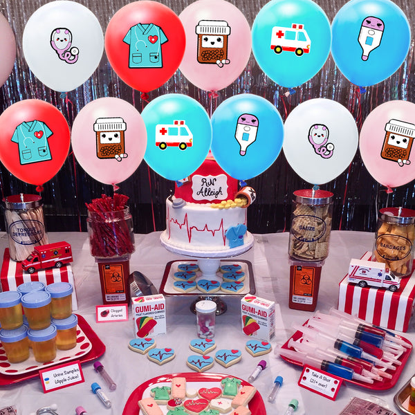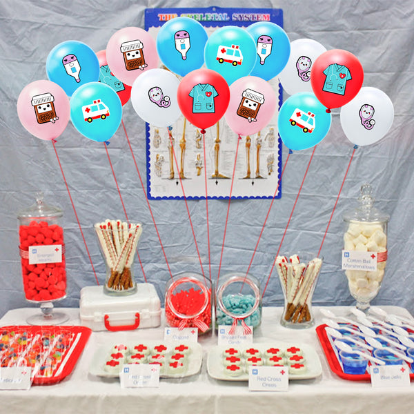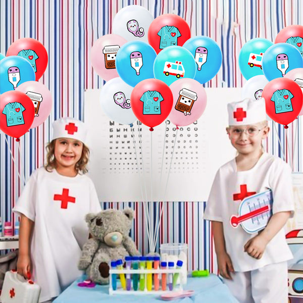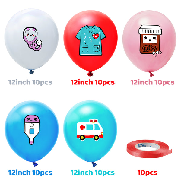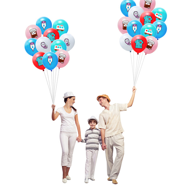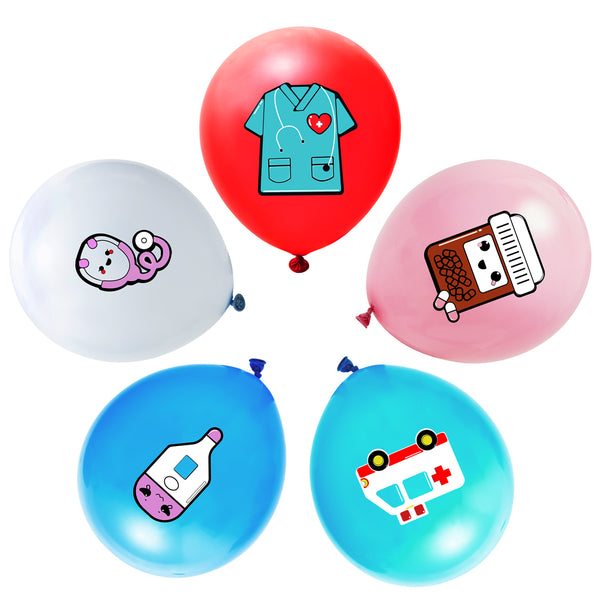 VALUE PACK - Package includes 50Pcs balloons which printed with different colors and different patterns (Red-medical clothing/Blue-thermometer/White-stethoscope/Pink-medicine/Pale Blue-ambulance), and 2 rolls of red ribbon.