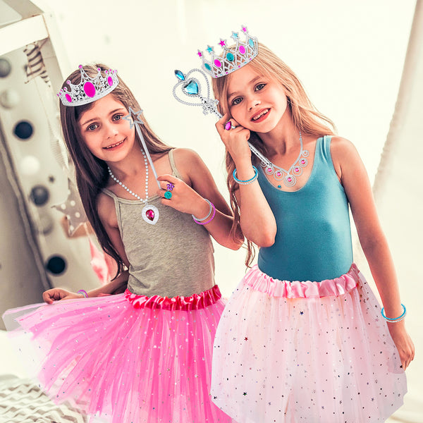VARIETY PACK- Package includes 5pcs different colors ballet tutu skirts, 5pcs crowns, 5pcs necklaces, 2pcs wands, 8pcs bracelets, 14pcs adjustable jewel rings and 12pairs of earrings.