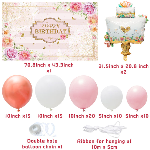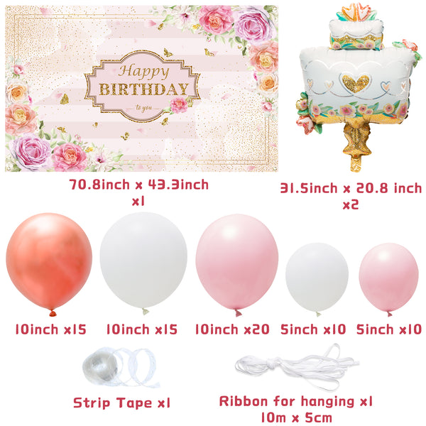 Package Including: 70*latex balloon(10 inches: 20*baby pink, 15*metallic rose gold, 15*white; 5 inches: 10*baby pink, 10*white), 2*cake-shaped foil balloons, 1*floral party backdrop banner, 1*strip tape, and 10m*5cm ribbon for hanging.