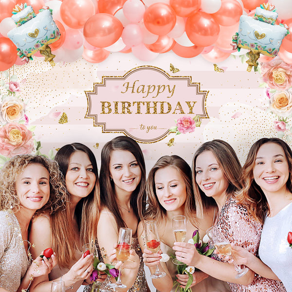 OSNIE 74Pcs Floral Theme Birthday Decoration Supplies Kit , Rose Gold Pink Balloon Arch Garland Happy Birthday Backdrop Banner Cake-shaped Foil Balloons for Birthday Bridal Shower Baby Shower Tea Party