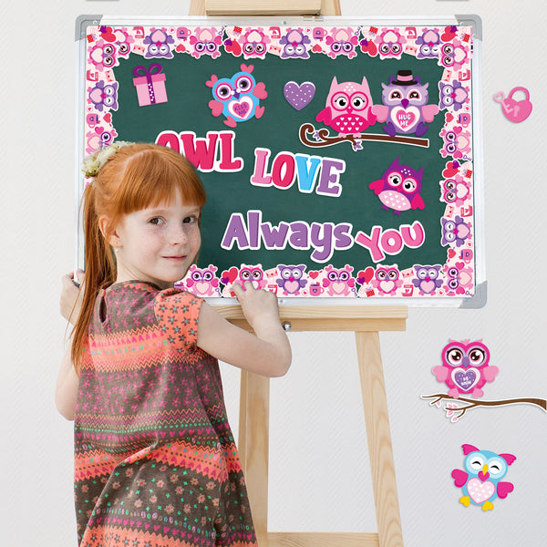 Owl Themed Bulletin Board Border Decoration - This set of decorations has a variety of very beautiful patterns such as owls, hearts, gifts and more. This border decoration set is perfect for spring, winter or Valentine's Day. You can use it with your kids to decorate any place you want, not only is it fun, but it also develops your kids' artistic creativity.
