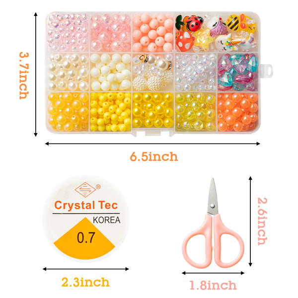 PACKAGE CONTENT – Including 400pcs+ beads, 12pcs charms, 2pcs pearl pendants, 1pc child-safety scissor and 1 roll of elastic crystal string. Stored in a clear plastic box.