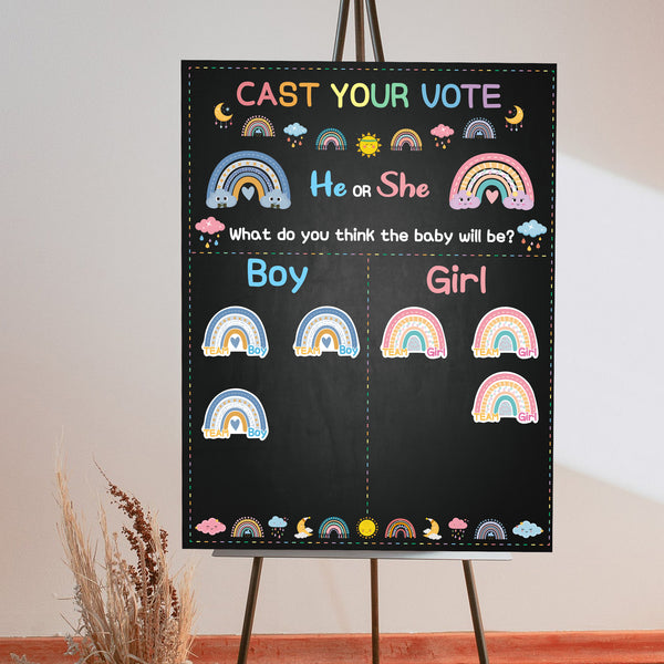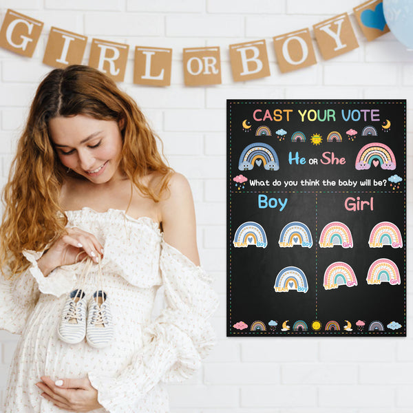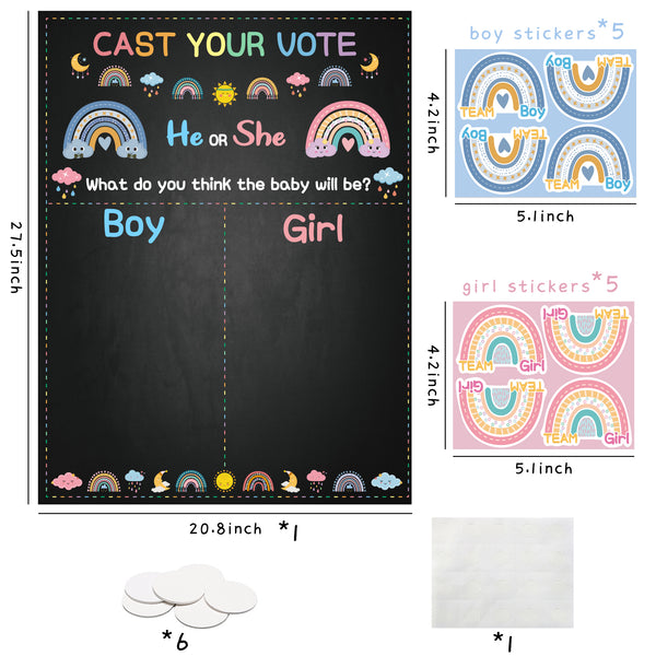 Package Contents: One large size gender reveal voting poster (boho rainbow style), 20 voting stickers for the boys' team, 20 voting stickers for the girls' team, 6 round foam stickers and one sheet of glue point.