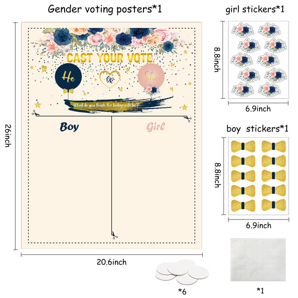 Suitable Size: The gender reveal voting poster measures 26 x 20.7 inches. The sticker size is 8.8 x 6.9 inches. There are ten small stickers on each sticker. The poster and sticker are big enough that you don't have to worry that people won't notice it or struggle to read it.
