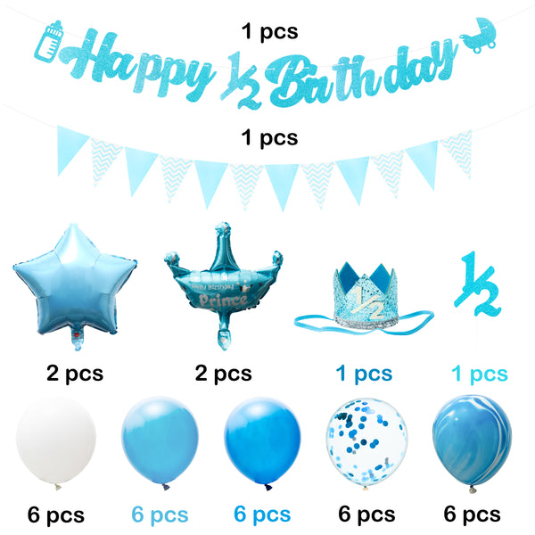 PACKAGE INCLUDED: 1 x happy 1/2 birthday banner, 1 x blue pennant flag, 1 x 1/2 cake topper, 1 x 1/2 party crown hat, 2 x giant star foil balloons, 2 x giant crown foil balloons ,30 x latex balloons(glitter/white/blue) and 1 sheet of glue stickers.