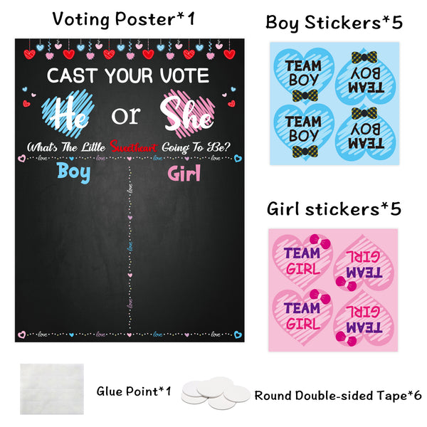 The Package Includes: 1 big voting poster and 40 team boy team girl stickers (20 in blue and 20 in pink). There are also 6 round foam stickers and 1 glue dot. These accessories allow you to easily fix the poster on the wall and the sticker on the poster.