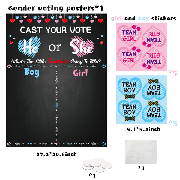 The Package Includes: 1 big voting poster and 40 team boy team girl stickers (20 in blue and 20 in pink). There are also 6 round foam stickers and 1 sheet of glue points. These accessories allow you to easily fix the poster on the wall and the sticker on the poster.